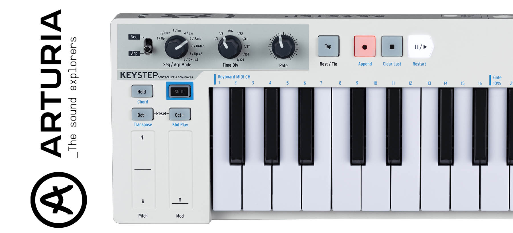 Одні тільки ці характеристики роблять KeyStep найкращим портативним клавіатурним контролером на ринку. Але Arturia йде далі, пропонуючи вам безліч варіантів підключення: USB MIDI (звичайно ж), стандартні MIDI-вхід і вихід (є), роз'єми синхронізації тактової частоти і DIN-синхронізації (так!), а також виходи CV/GATE, а також окремий вихід CV для модуляції, що призначається, який можна використовувати з колесом модуляції, швидкістю натискання або після-дотиком. Сказати, що KeyStep це приголомшливий маленький контролер, значить нічого не сказати!