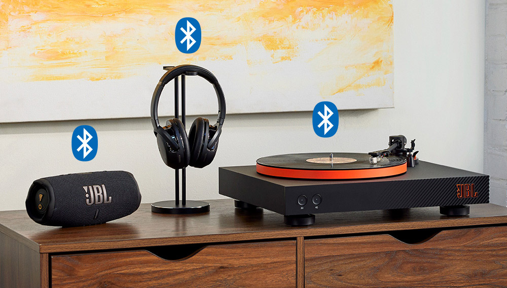 Компанія JBL славиться своїми портативними акустичними системами PARTYBOX, а також іншими лінійками професійної акустики, які відмінно підійдуть для прослуховування музики, які можна підключити до програвача вінілових платівок JBL Spinner BT, як з кабельного з'єднання, так і бездротового зв'язку Bluetooth.