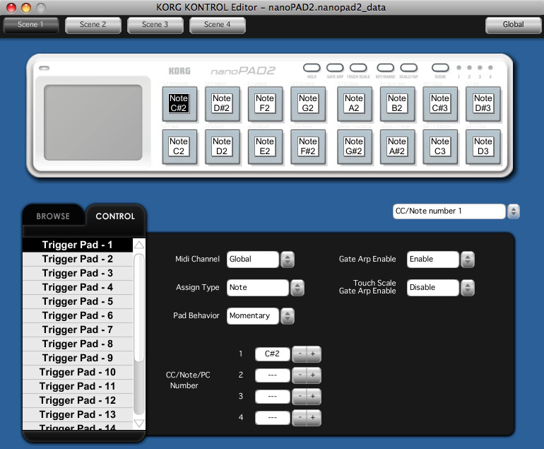 nanoPAD2 працює з програмним забезпеченням "KORG KONTROL Editor", яке доступне безкоштовно на веб-сайті Korg (перейти на сторінку товару на сайті виробника для завантаження ПЗ). Завантажте його на свій комп'ютер і використовуйте для детальних індивідуальних налаштувань. Виберіть одну з чотирьох опцій швидкості: три криві швидкості або фіксовану швидкість. Ви також можете вказати номери нот, створити гамми для функції Touch Scale, призначити акорди, призначити повідомлення про зміну управління і зберегти налаштування.