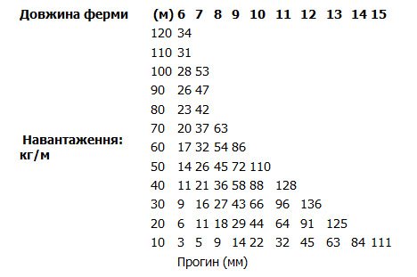 Таблиця концентрованого навантаження на середині ферми: